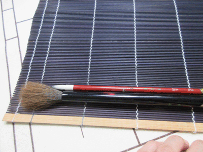 筆は、端に置きます。この時に、筆巻きから、筆の毛先(画像左側)が、はみ出ていない事を確認してから、巻きましょう。