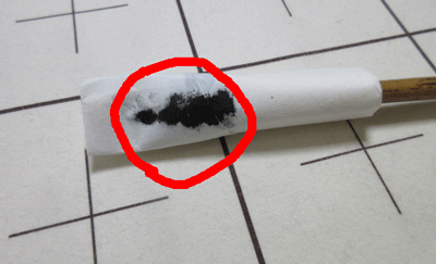 ただ、練習後の筆は、予想以上に、墨が含まれています。半紙で包んでも、墨が外まで染みてしまう事もあります。↓