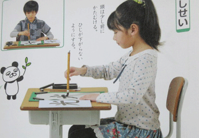 毛筆で書く時にも、背筋を伸ばして書きましょう。ひじは、机に付かないように、少し、浮かせてくださいね。
